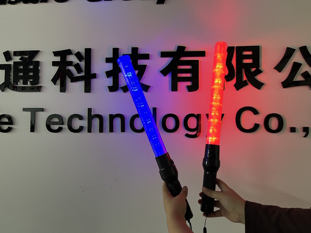 Un témoin de circulation de haute visibilité avec éclairage LED, surfaces réfléchissantes et un sifflet intégré pour une sécurité et une communication améliorées dans les situations de contrôle de la circulation.